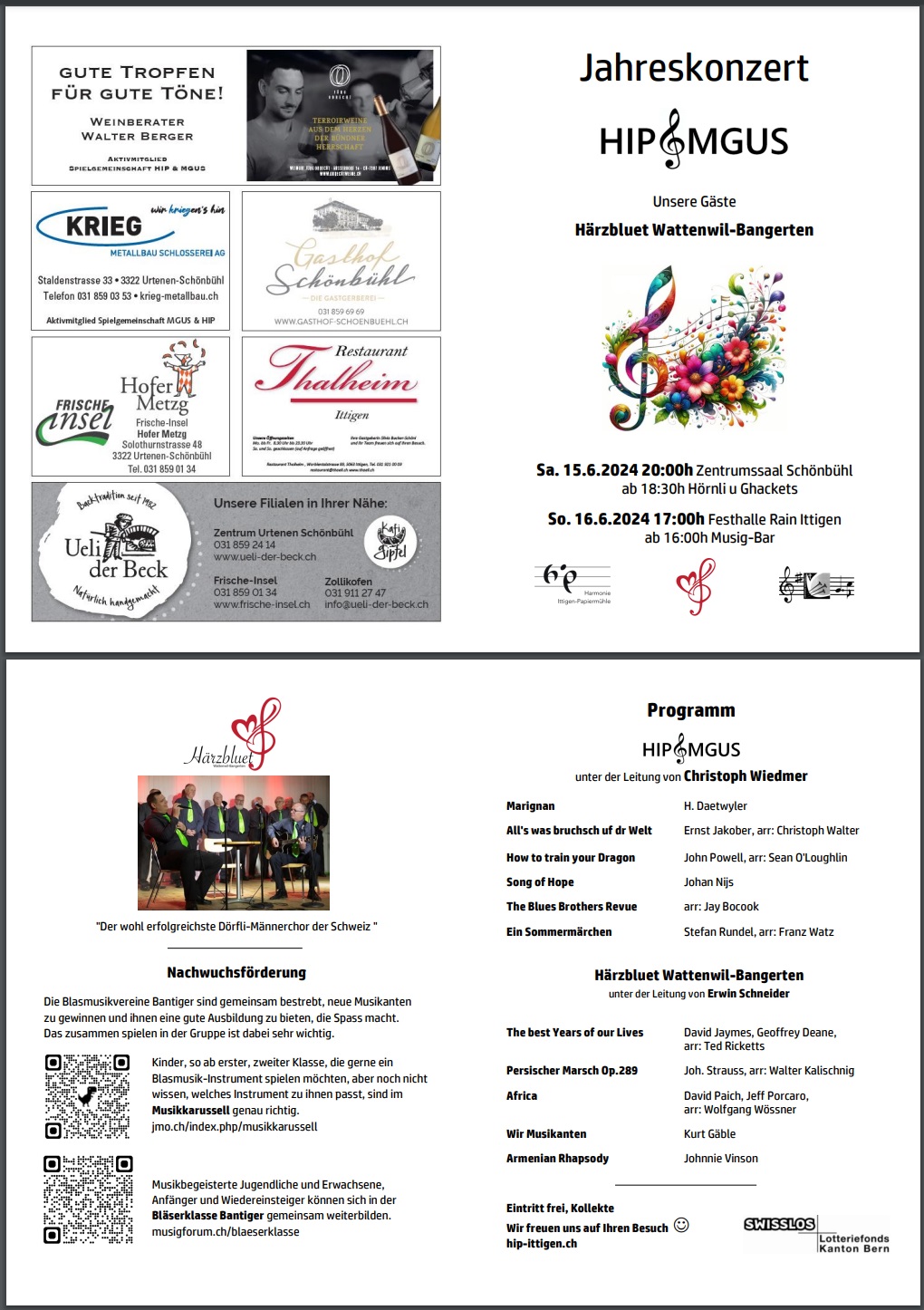 Am Sa. 15.6.2024 im Zentrumssaal Schönbühl und am So. 16.6.2024 im Festhalle Rain Ittigen konzertierte HIP&MGUS. Dieses Jahr waren „Härzbluet Wattenwil-Bangerten“ unsere Gäste und überzeugten mit ihrem mitreissenden Gesang.